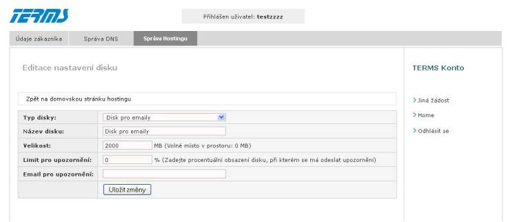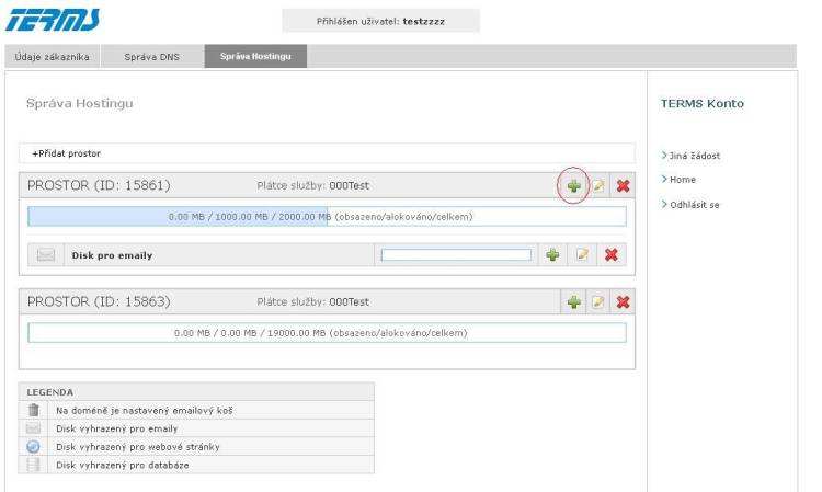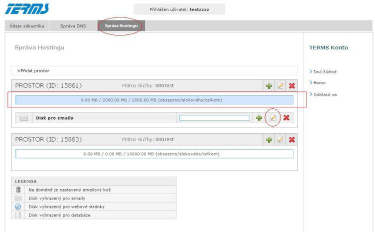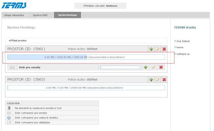 Po přihlášení do TERMSkonta se přesuneme do sekce Správa Hostingu. Zde je vidět kolik prostoru máme celkem a kolik ho je již někam přiděleno. Přidělený prostor je zobrazen světle modrou barvou. V našem případě je přidělen (alokován) všechen prostor a pokud by jsme chtěli vytvořit nový disk, je potřeba nějaké místo uvolnit.