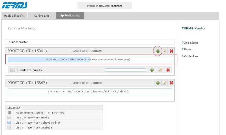 Po přihlášení do TERMSkonta se přesuneme do sekce Správa Hostingu. Zde je vidět kolik prostoru máme celkem a kolik ho je již někam přiděleno. Přidělený prostor je zobrazen světle modrou barvou. Nepřidělený prostor je zobrazen bílou barvou. Pro vytvoření nového disku je potřeba mít volný (nepřidělený) prostor. Pokud prostor nemáme volný je potřeba si ho vytvořit. Návod na uvolnění místa najdete v sekci Alokace