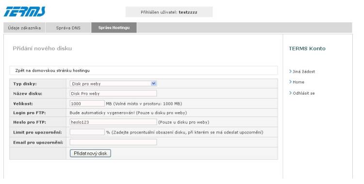 - Zvolte Typ disku (u webového disku je nutné vyplnit i heslo)