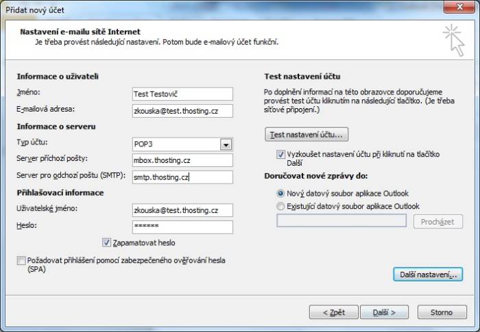 - Server odchozí pošty zadejte smtp.thosting.cz
