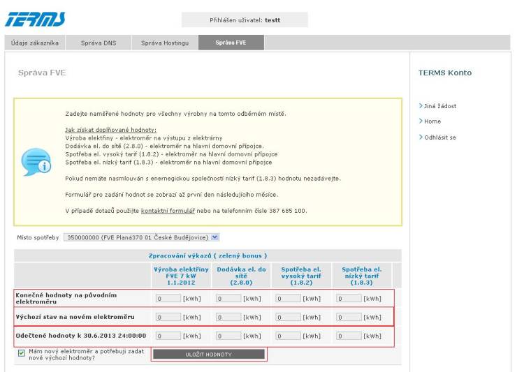 - Do řádky Výchozí stav na novém elektroměru zadejte hodnoty naměřené na novém elektroměru těsně po instalaci